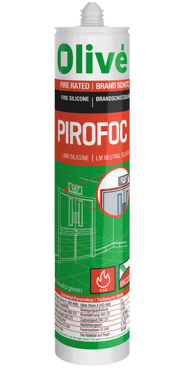 Olivé PIROFOC SILICONE este un silicon low modulus, mono-component, neutral, pentru etanșări elastice cu rezistență la foc. Este special conceput pentru etanșarea la intemperii a îmbinărilor de dilatație și în cazul în care este necesară o rezistență la foc. Are o aderență excelentă pe o gamă largă de substraturi poroase și neporoase și este, de asemenea, adecvat pentru utilizare în penetrații, cum ar fi cele de cabluri, canalele, prin structuri cu rezistență la foc.