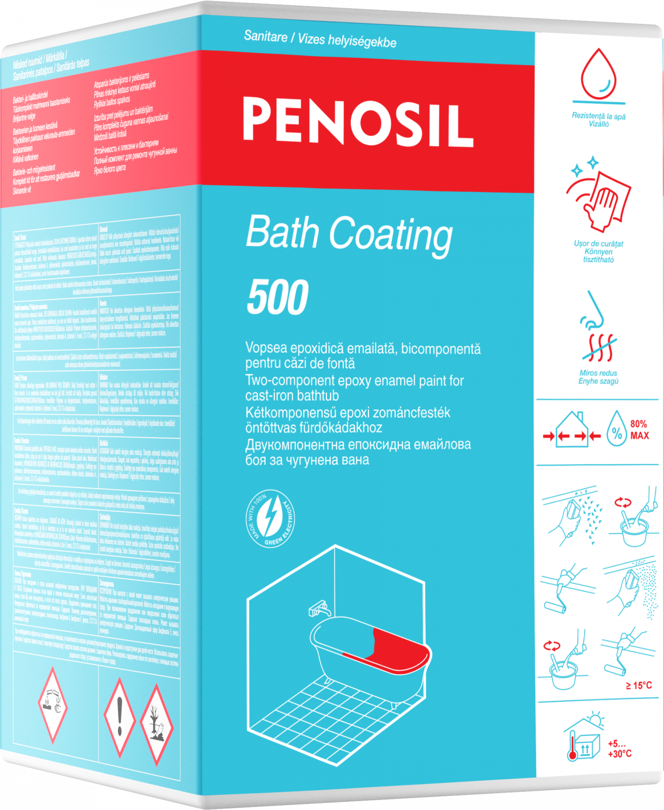 PENOSIL BathCoating 500 este o vopsea epoxidică pe bază de apă pentru restaurarea căzilor. Nu are miros în timpul aplicării, este igienică și după uscare poate intra în contact cu alimentele. Vopsea epoxidică pe bază de apă, emailată, inodoră, pelicula de vopsea uscată permite contactul cu alimentele, ecologică, rezistentă la bacterii şi mucegaiuri, setul include toate elementele necesare recondiţionării unei căzi de baie din fontă, procesul de vopsire constă în două etape, cada este gata de utilizare la 7 zile după vopsire.